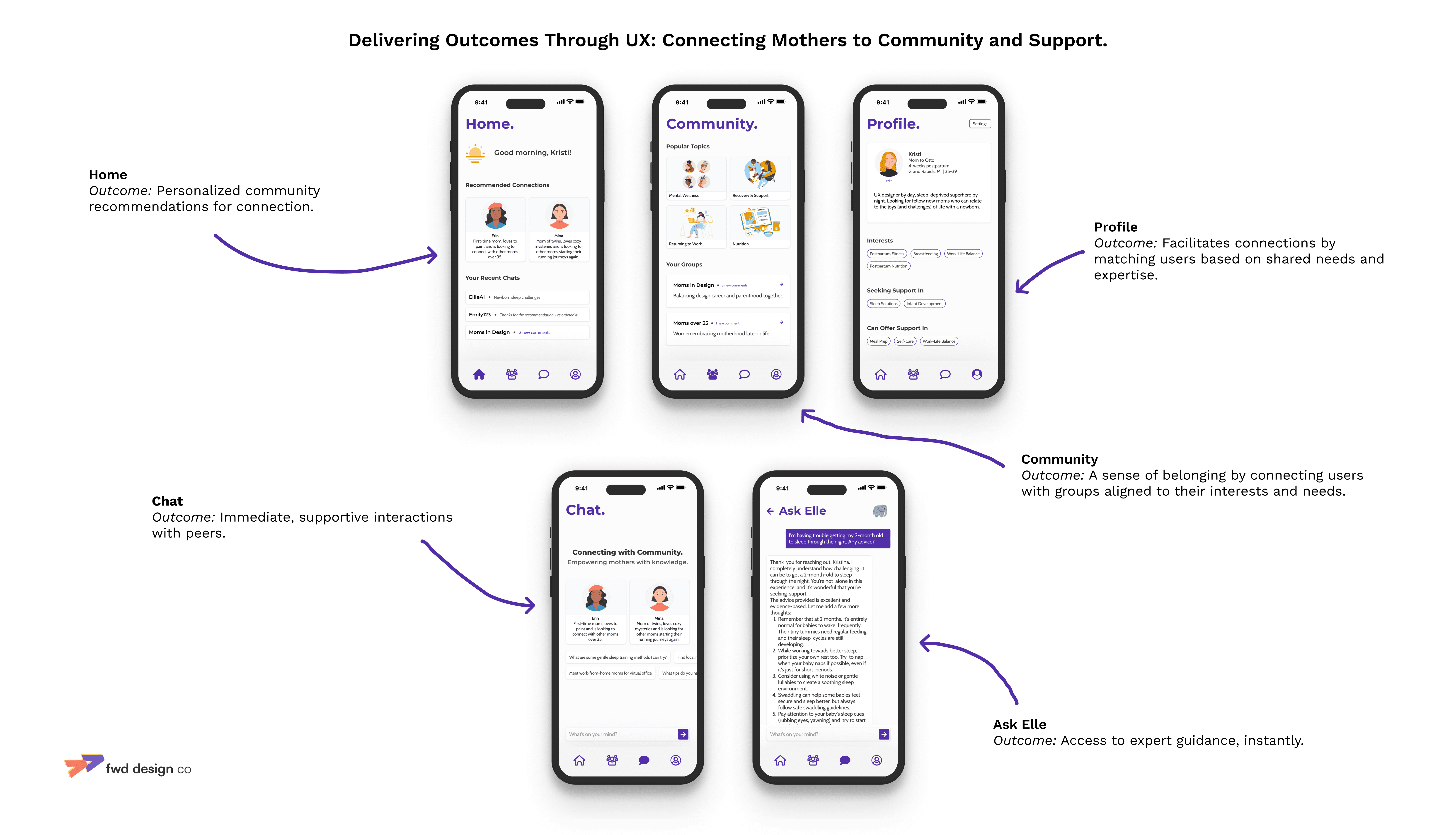 Mothering Together’s solution leverages AI-driven personalization and community engagement to support postpartum mothers through: